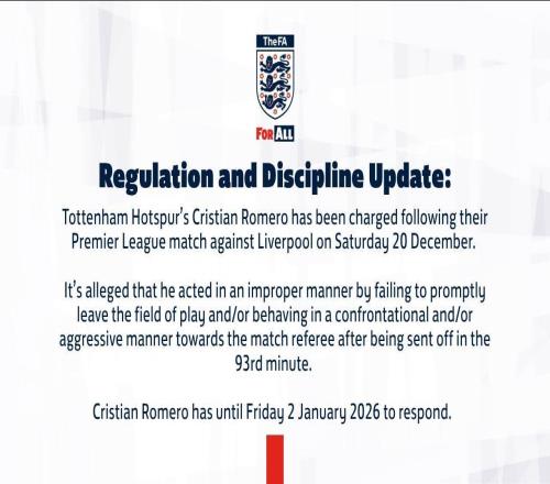 官方:罗梅罗因对利物浦染红后攻击性对抗裁判被英足总指控