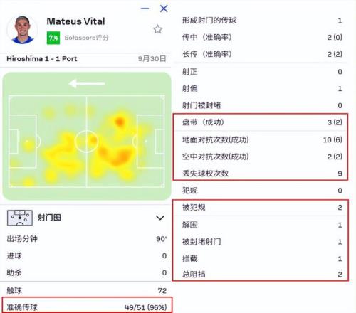 同时中场外援维塔尔起到了不小的作用,他全场比赛传球成功率高达96%,12次一对一对抗赢下8次,还有5次成功防守数据,2次制造对方犯规,只丢了9次球权。