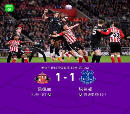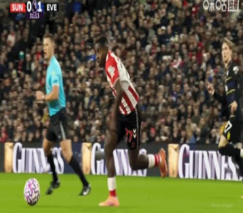 第46分钟,勒费埃回传,扎卡弧顶处低射破门扳平比分,桑德兰1-1埃弗顿