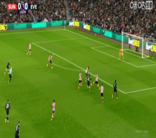 第15分钟,恩迪亚耶过掉三人晃开角度起脚破门,埃弗顿1-0桑德兰
