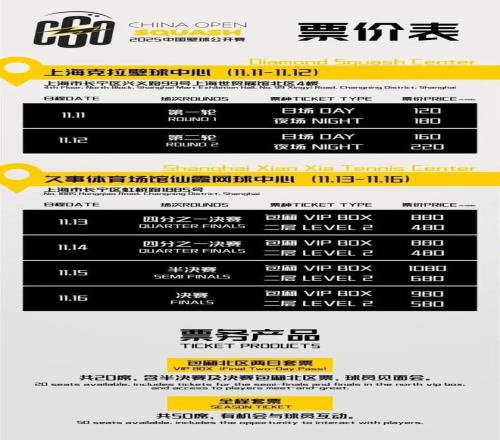 本届比赛的赛程延长至6天,首次采用“双主场”模式。11月11日至12日的前两轮比赛将在上海克拉壁球中心展开,11月13日的四分之一比赛开始,赛事将来到久负盛名的久事体育场馆仙霞网球中心,以不同场馆的展示特性,来打造多层次、全景式观赛体验。赛事票务销售已于10月17日中午12时正式启动。