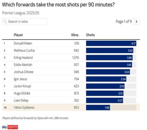 他场均(每90分钟)1.98次射门的总数据,在本赛季Opta统计的出场时间占比至少20%、被列为前锋的81名球员中,仅排在第45位。哲凯赖什在这份榜单上位列西汉姆联的尼古拉斯-菲尔克鲁格和布莱顿的乔治尼奥-鲁特之间。