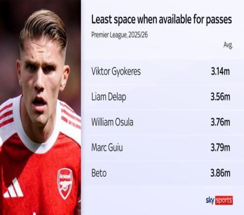 根据GeniusIQ数据,哲凯赖什本赛季在可接球状态下,平均拥有的空间距离(3.14米)是英超所有球员中最少的。这项数据反映了他难以通过跑动摆脱防守球员的困扰。