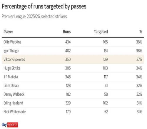 GeniusIQ的追踪数据显示,针对他跑动的传球尝试比例,甚至高于利物浦的埃基蒂克或曼城的哈兰德。