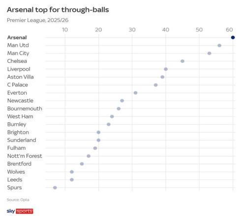 但他的队友们正在尝试。根据Opta数据,阿森纳本赛季的直塞球次数是英超各队中最多的。他们的场均直塞数从上赛季的略高于2次大幅提升至本赛季的近4次,增幅近80%,这反映了球队在增加传球穿透性方面所做的共同努力。