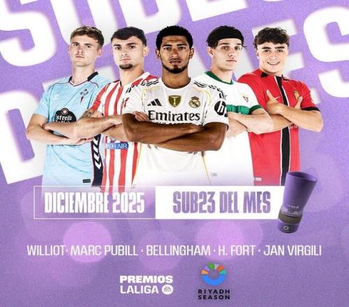 北京时间12月24日,西甲官方公布了12月最佳U23球员的候选名单,其中贝林厄姆、马克-普维尔、埃克托-福特等球员在列。