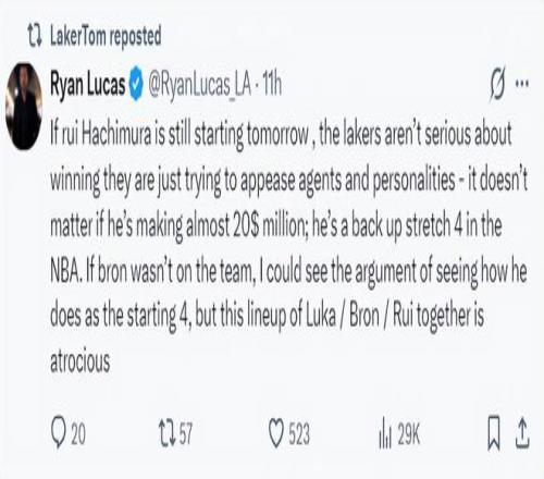 其实一天之前湖媒Laker Tom就抛出了论点,詹姆斯与八村垒都是四号位,都需要一个能防守的三号位去协防补位,这两人同时登场会制约彼此的发挥。