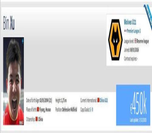身价45万欧元!U23国足队长、青岛西海岸球员徐彬已正式加盟英超狼队