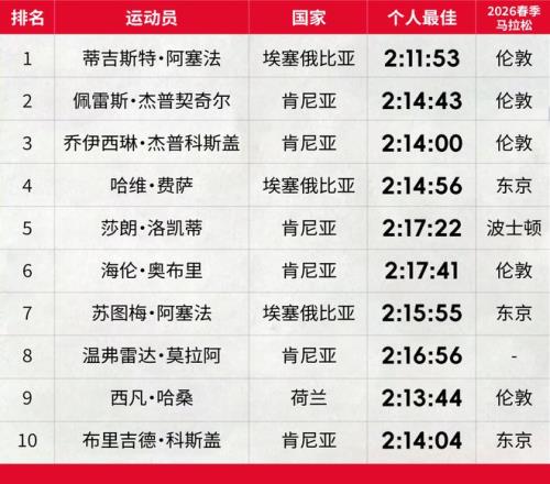 总的来说,2026年伦敦马拉松的阵容包括了2025年八大雅培世界马拉松大满贯赛事中四站的卫冕冠军——伦敦(阿塞法)、悉尼(哈桑)、世锦赛(杰普契奇尔)和纽约(奥布里),以及瓦伦西亚冠军(杰普科斯盖)。
