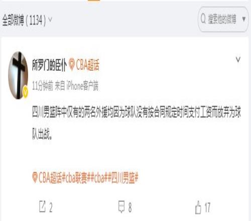 北京时间1月30日,四川男篮在第21轮比赛重回全华班模式引发猜测,如今根据媒体人所罗门的臣仆报道,四川男篮的两位外援是因为球队没有按时支付工资,导致他们放弃为球队继续征战。