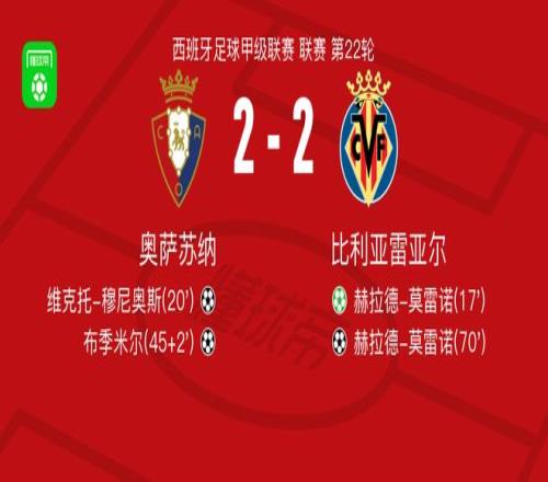 北京时间1月31日西班牙足球甲级联赛 联赛 第22轮,奥萨苏纳主场对阵比利亚雷亚尔。奥萨苏纳维克托-穆尼奥斯破门,布季米尔破门。比利亚雷亚尔赫拉德-莫雷诺梅开二度。最终比分奥萨苏纳 2-2 比利亚雷亚尔。