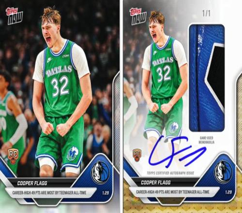 · 单人纪录版本:除了双签卡,Topps Now还同步发行了两人的单人版本卡片,分别记录弗拉格的生涯新高49分(青少年历史纪录)与克努佩尔的生涯新高34分(黄蜂新秀三分纪录)。单人版同样包含实物签字新秀卡的随机插放,发送给幸运的订单。