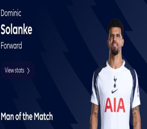 梅开二度,索兰克当选热刺vs曼城全场最佳球员